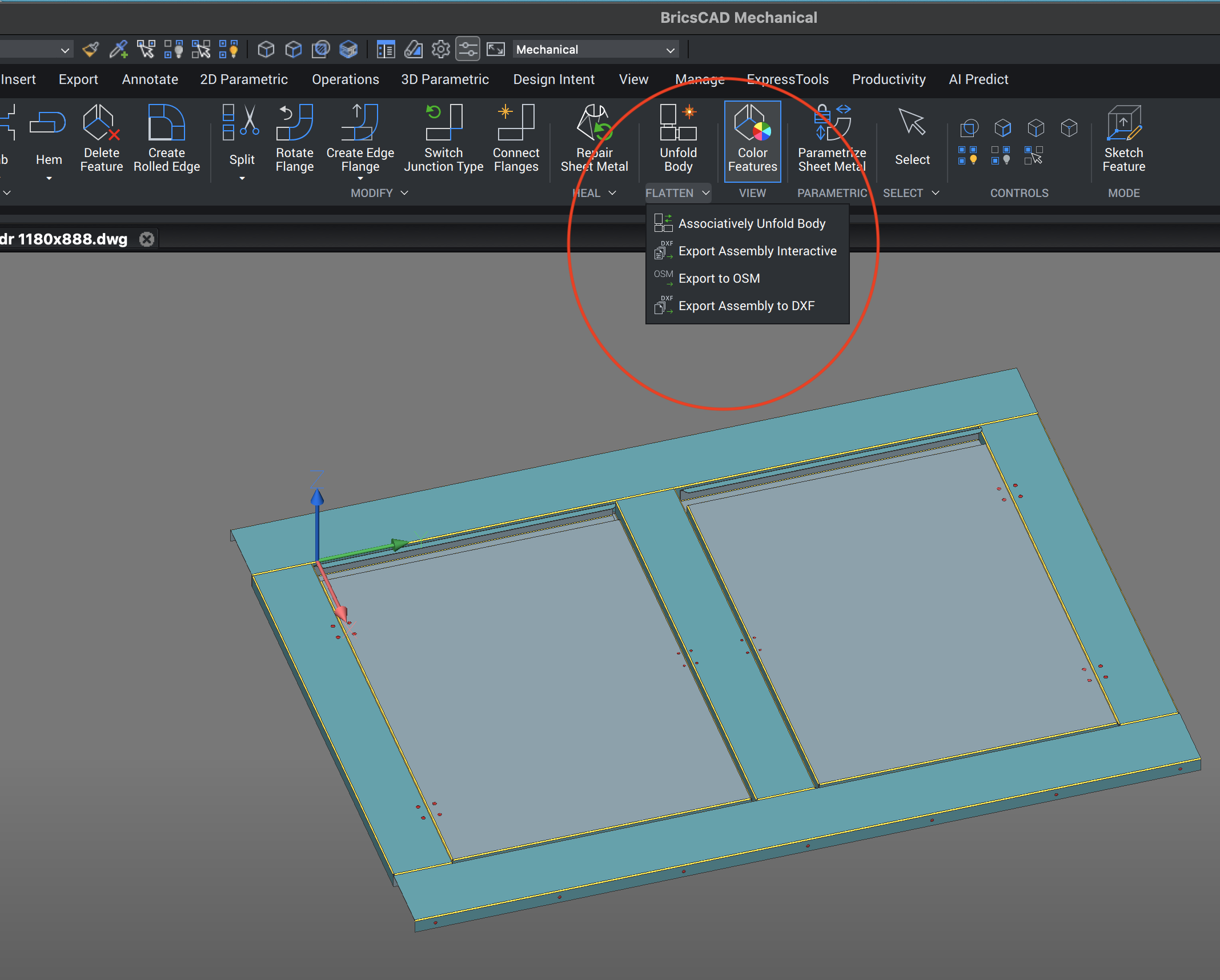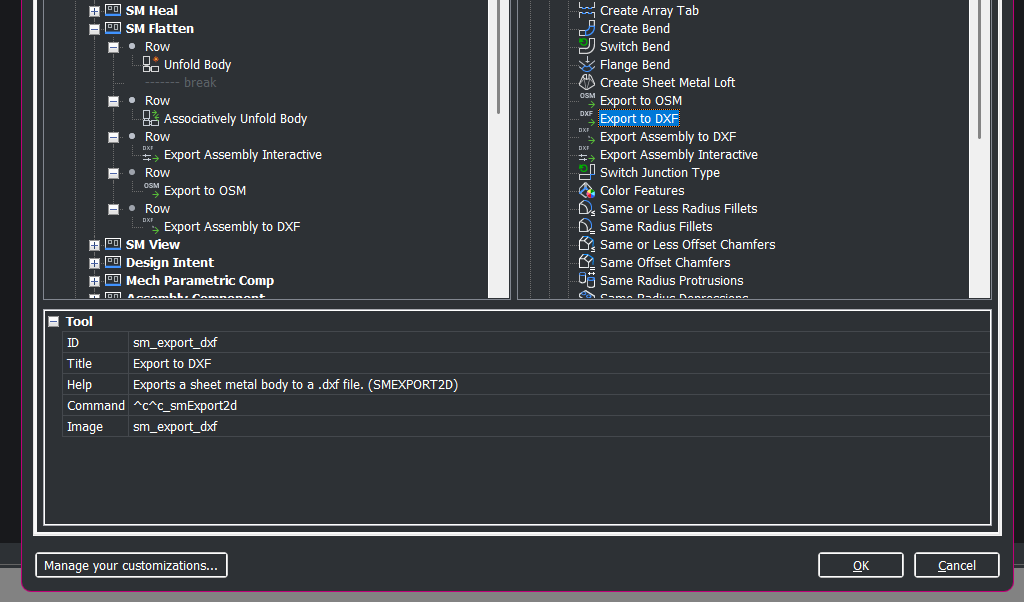 Then, from the Sheet Metal toolbox, the SMEXPORT2D tool could be dragged to the newly created row.