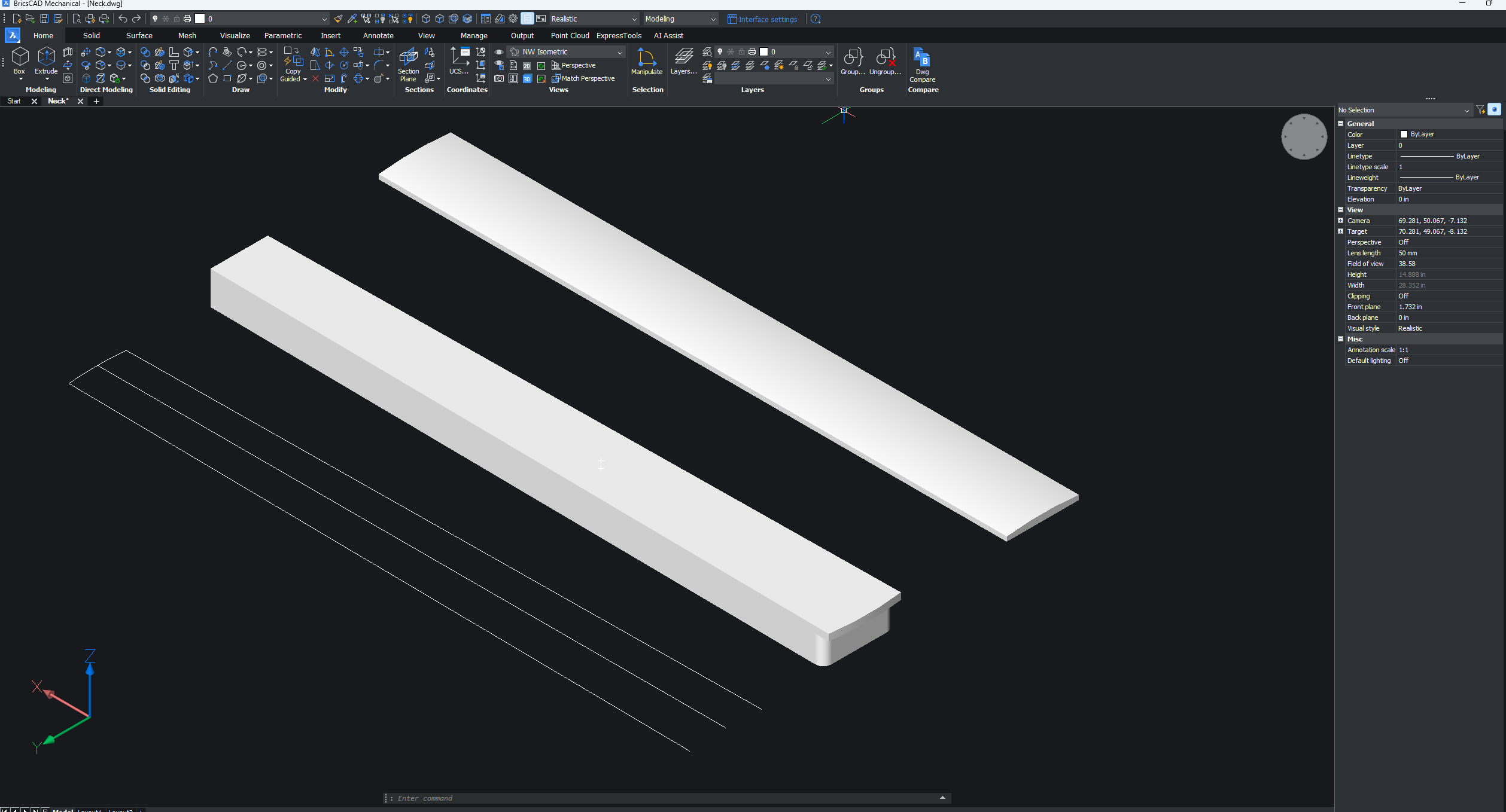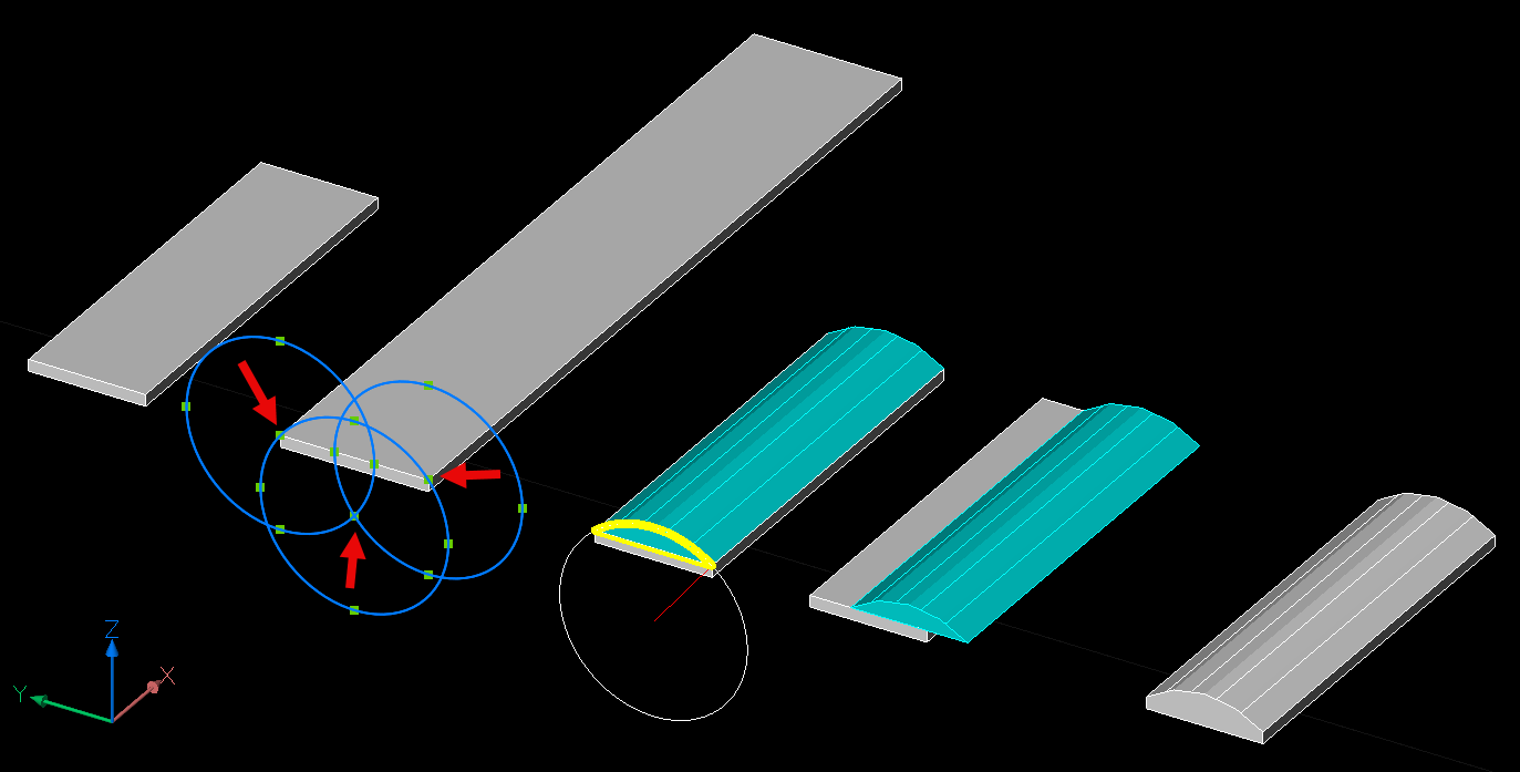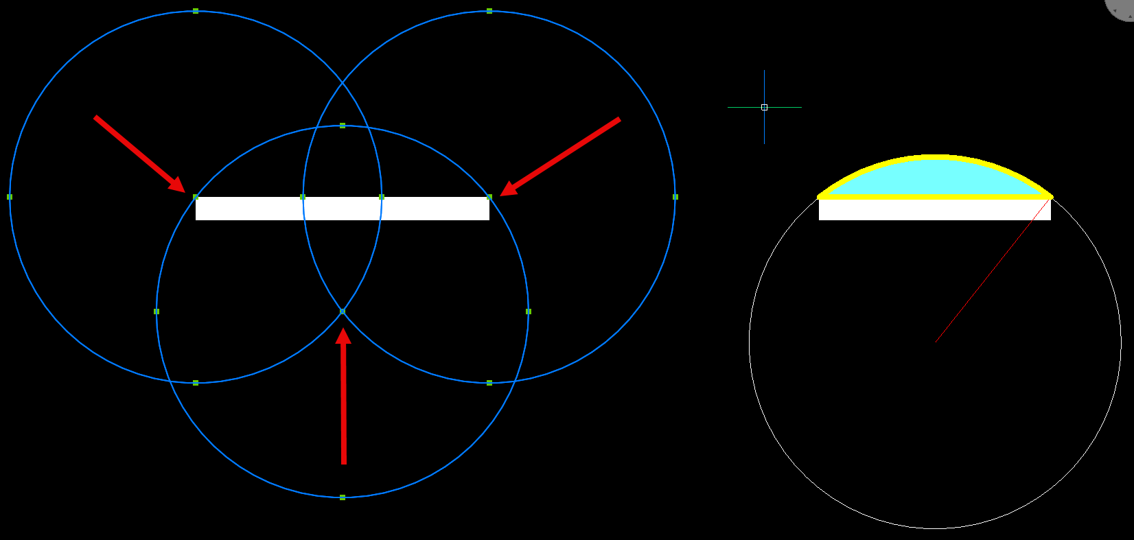 First draw 2 circles with R = 9.5"(24,13 cm) in order to find the center of the the arc needed to construct the new solid on top of the old one:You can now produce a closed polyline, the yellow one and extrude it to a solid.