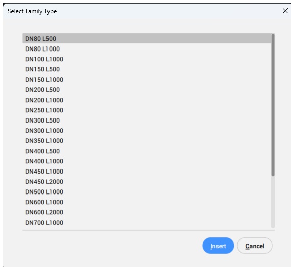 I would like to know if it is possible to insert an .rfa block into BricsCAD BIM when it has multiple selection parameters. For example, when I insert the .rfa block (with the BMINSERT command), I have several options to choose from (see image1.jpg). If I select the default option (DN80 L500), the block is inserted successfully. However, if I choose another option, the block is not inserted and I get the error message shown in image2.jpg