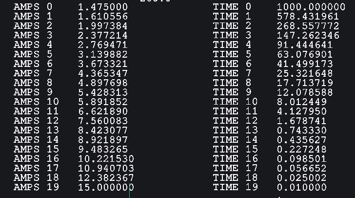 This data shown above is for a 200A fuse. Amps are in PU multiples of 200A. Time is in seconds. From the imported TCC you can see at 400 amps (2X200) the imported curve shows a time of 268 seconds corresponding with data point 2 (1.99PU, 268Sec).