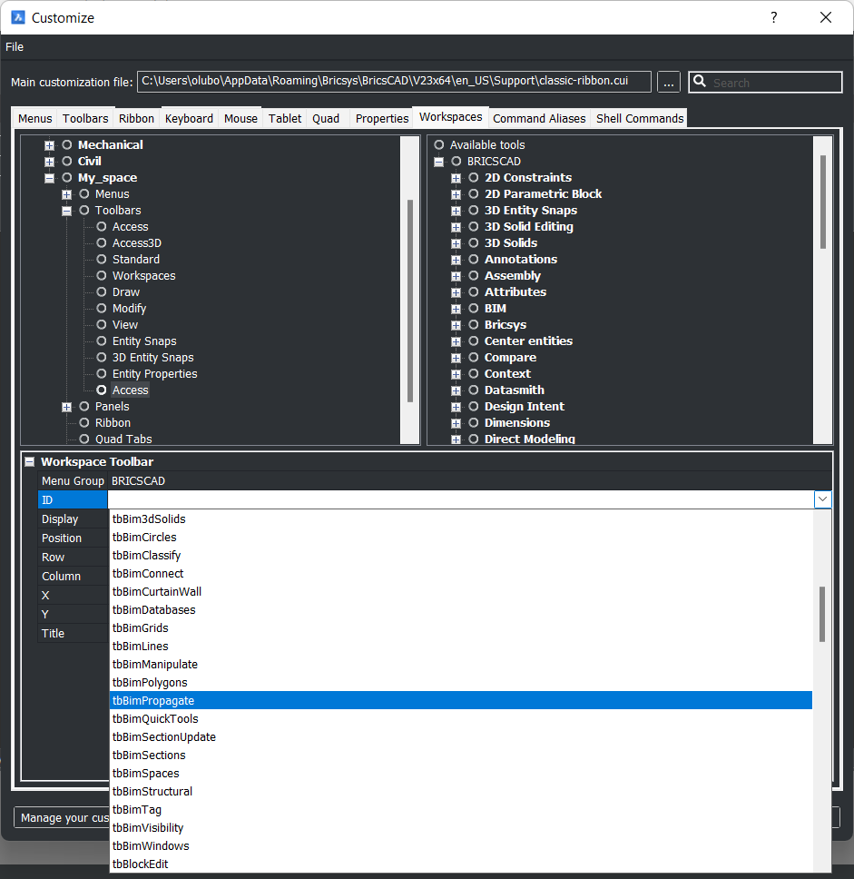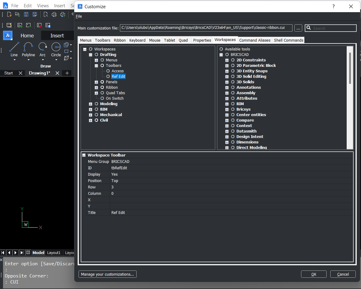 also in Workspaces>tom's>Toolbars, I have to have RefEdit included. How to get that? The only other ready-made workspace that includes it is Drafting. I can drag Refedit from there to tom's, but can't find how to instead copy/paste RefEdit from either Drafting in the left column, or from the right column.In Workspaces>tom's>Toolbars, I can right-click Toolbars>Append Toolbar, but it always appends Access toolbar, whatever I do, like highlighting Refedit beforehand.