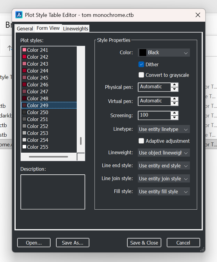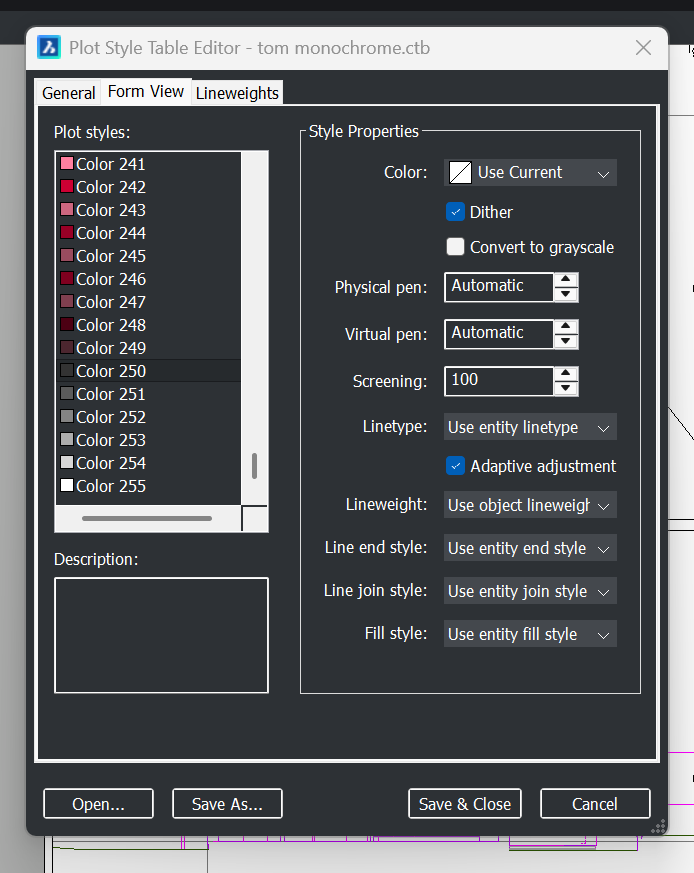 Attached is the ctb. Pic ..909 shows Color: Black for Index colors 1 to 249; Pic ..605 shows Color: Use Current for 200 to 255 (the greyscales). So to get coloured lines I have to invent a non-index colour.